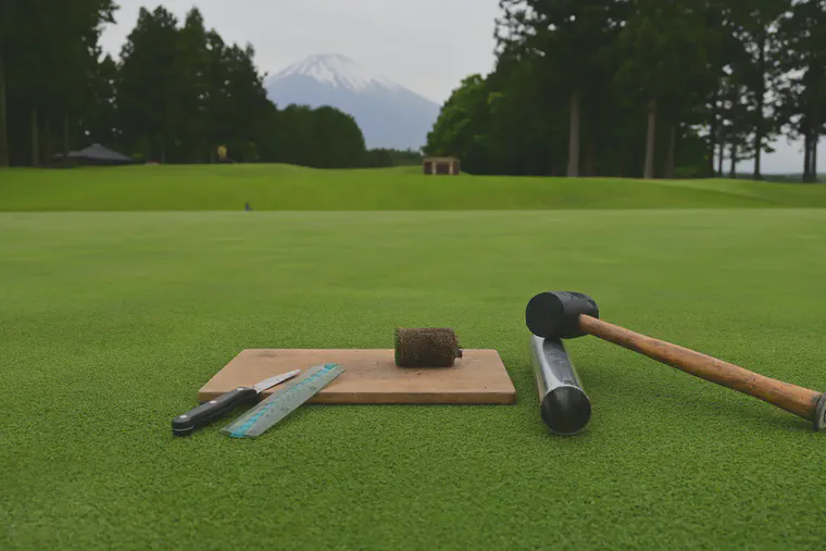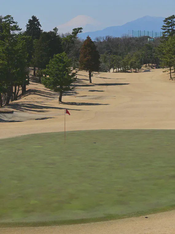 March, Mt. Fuji seen from Yokohama, a creeping bentgrass green, and dormant zoysiagrass through the green.