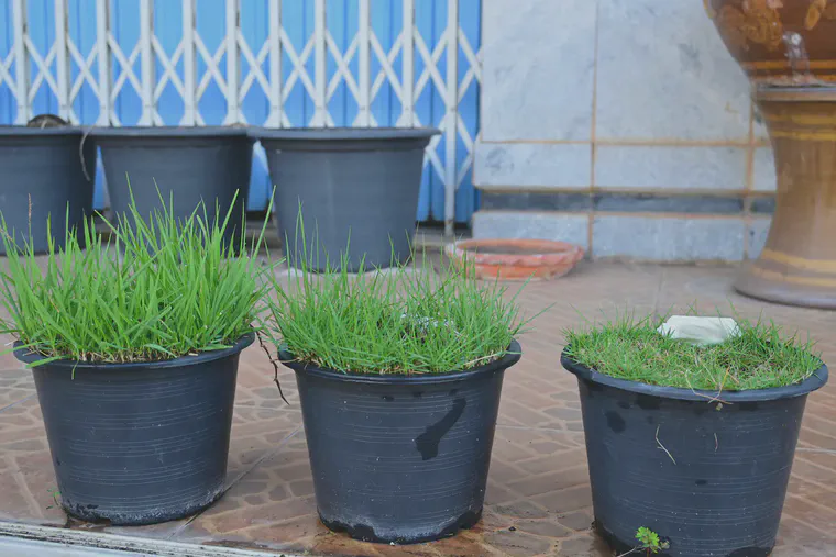 January, these three pots are three selections of zoysiagrass from the same putting green. I’ve grown them in pots with infrequent mowing to allow the leaves to extend.