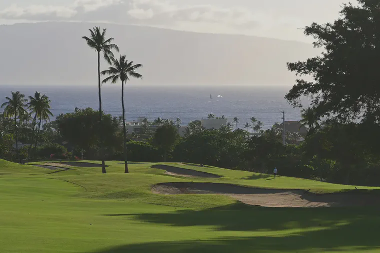 March, Cynodon fairway with a breaching whale and sailboat off the west coast of Maui.