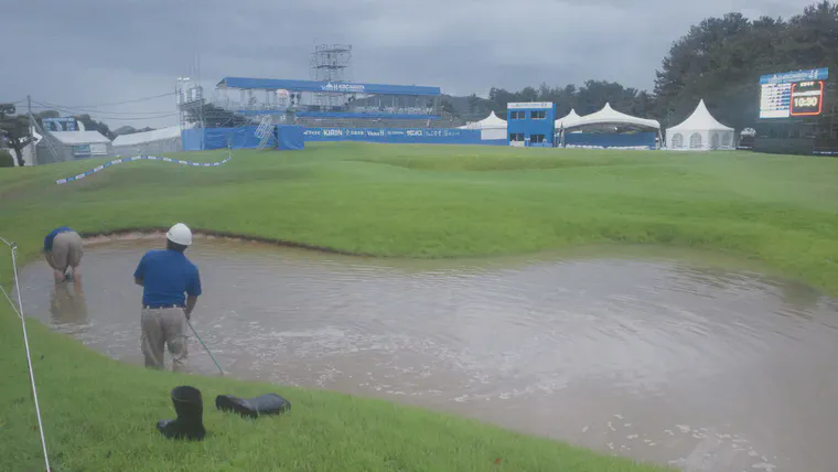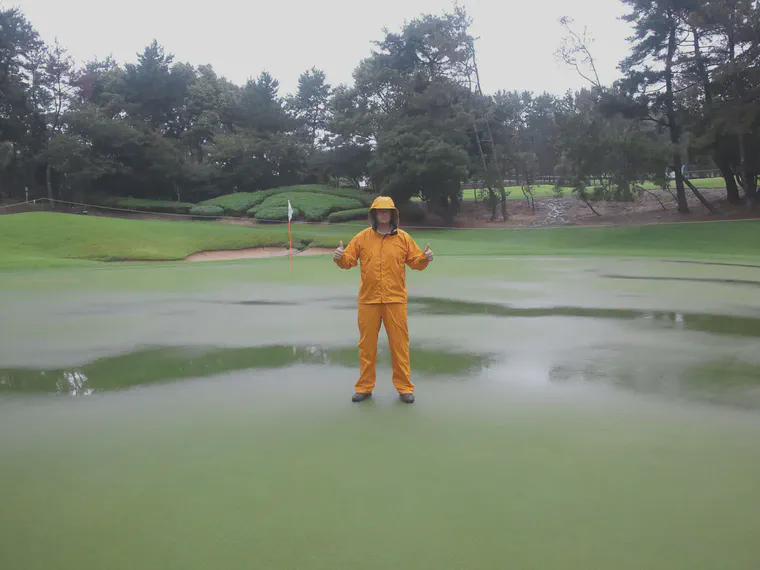 The rain wasn’t over, however, as tropical storm Kong-Rey passed right over Fukuoka on Friday night. So there was an additional 200+ mm of rain that fell on the course, flooding bunkers and covering greens and fairways with standing water.