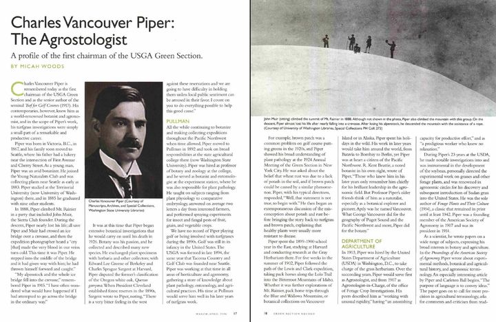 Charles Vancouver Piper is remembered today primarily as the first chairman of the USGA Green Section and co-author of the influential Turf for Golf Courses (1917), but his contemporaries knew him as a world-renowned botanist and agronomist whose turfgrass work represented only a fraction of his remarkable career. Born in Victoria, B.C., in 1867, Piper was an avid naturalist from youth, collecting plants near Seattle as early as 1883 and surviving a near-fatal fall into a crevasse during an 1888 Mt. Rainier expedition with John Muir. After studying at the Territorial University and working at Washington State’s agricultural college in Pullman, where he taught subjects ranging from plant physiology to entomology, Piper joined the USDA in 1903 as Agrostologist. Over 23 years there, he made groundbreaking contributions to American agriculture, including introducing Sudan grass, developing the soybean as a crop, authoring the classic Forage Plants and Their Culture (1914), and serving as president of the American Society of Agronomy. Piper’s expertise with grasses naturally led golf course developers to seek his guidance, culminating in the formation of the Green Section in November 1920. As chairman and editor of the monthly Bulletin, Piper combined his directorship of the USDA’s Forage Crops Division with extensive Green Section travel and correspondence, all while continuing his botanical research—even collecting willow specimens during a 1923 visit to Portland golf courses. Though illness limited his final year and he died from a stroke in February 1926, Piper’s vision for the Green Section endured. He had called for expanding the organization with trained assistants who could travel the country providing consultation to golf clubs, recognizing that he and Oakley were ‘growing old’ and needed ‘youngsters trained to carry out the work.’ His desire to put the Green Section ‘on a permanent basis so that its functions of investigation and education might enlarge and endure’ has been realized, establishing a foundation for the modern turfgrass industry.